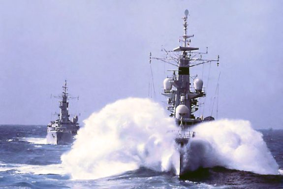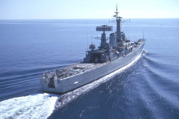 HMS Naiad was the first Leander-class frigate to be fitted with quadruple Seacat launchers instead of 40-mm guns. She was launched on the 4th November 1963 and commissioned on the 15th March 1965. In 1966, Naiad became the leader of the Northern Ireland Squadron, relieving HMS Penelope, and subsequently deployed to the Far East and South America. In 1970 she began her first deployment to the Far East and whilst there participated in the Beira Patrol, designed to prevent oil reaching landlocked Rhodesia (now Zimbabwe) via the former-Portuguese colony of Mocambique. She performed her second patrol the following year. The Beira Patrol would be a regular deployment for the Royal Navy until 1975.
